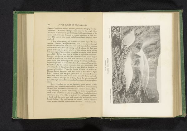 Curator: Here we have a print titled “Doorkijk op Yosemite Valley” from before 1886 by George Fiske, specifically a gelatin silver print featured within a book. Editor: Wow. It feels...contained. The raw, untamed vista of Yosemite, mediated by text and bound. Almost like nature itself is being archived, like a pressed flower between pages. Does it still breathe? Curator: The composition, regardless, adheres to certain landscape conventions. Note the placement of the trees as framing devices and how that guides the viewer's eye toward El Capitan—or what I believe to be that majestic stone structure rising above the valley in the image. There’s a distinct play with depth using light and shadow too. Editor: Yes, the light—that diffused, almost reverent glow. It’s the light of Manifest Destiny painting Yosemite as this promised land, untouched and ready for the taking...except it *wasn't* untouched. This photo, existing within this book, echoes the layers of meaning and the uncomfortable relationship to that landscape. Curator: Indeed. The photographic technology of the time, while advanced, necessarily flattened the dynamic, tactile experience. That compression itself serves a semiotic function—distances collapsed and dramatized into a view. Editor: It makes me consider what we lose when we frame nature, contain it within pages. Though beautiful and stark, does it begin to obscure the complete history and stories layered into every inch of the valley? Curator: These points, as ever, invite layers of consideration about access and context—offering vital frameworks as we examine Fiske's piece today. Thank you for joining me. Editor: Thank *you*. It has left me with questions I wasn’t expecting!