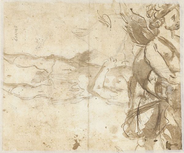 Giulio Romano made this drawing of Jupiter sometime in the first half of the 16th century, using pen and brown ink with brown wash over black chalk. As you can see from the faint traces of the underdrawing, the artist started with a piece of black chalk to map out the composition. He then applied the brown ink with a fine nib to define his mythological subject, Jupiter, king of the gods. Notice the lines of force that Romano used to imply Jupiter’s power, with the hatching suggesting both the thunderbolt’s trajectory, and the shadow cast by Jupiter's muscular body and flowing robes. It is not made with traditional or industrial materials, but there's a great deal of thought and control behind its execution. The quality of the line is very high, indicating that this was not just a casual sketch. Instead, Romano has carefully considered the visual effect produced through the application of washes, which has imbued the artwork with a certain cultural and aesthetic significance tied to that of craft and fine arts. This kind of work reminds us that the distinction between high art and craft can be less meaningful than we often think.