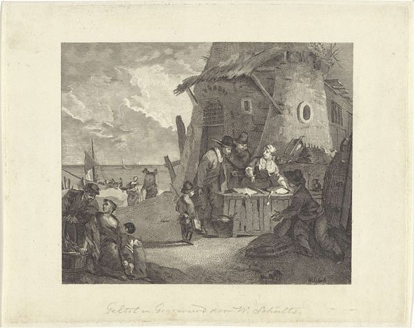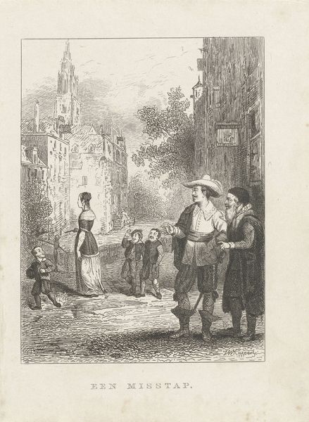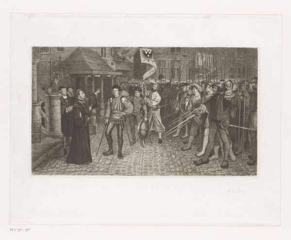 Editor: This is "Johan van Oldenbarnevelt op het schavot vóór zijn executie, 1619", a print by Jan van der Veen created sometime between 1853 and 1861. The scene is incredibly stark, a busy cityscape punctuated by the very sombre act taking place on the platform. What strikes me most is how many people are crammed into the scene. What details jump out at you? Curator: Oh, it’s a grim day in Dutch history immortalized in ink! I imagine Jan van der Veen conjuring this scene, thinking about power, betrayal, and public spectacle. Did he feel any particular empathy toward Van Oldenbarnevelt? It's an intimate scene viewed at a great distance – from those watching in the windows to the people squeezed shoulder to shoulder around the scaffold. But also note the strange separation – the viewer on the outside, forever disconnected from that heavy moment. Almost voyeuristic, wouldn’t you say? Editor: Definitely voyeuristic! It feels as though we’re peeking through a window at something we shouldn't be seeing. It also seems to be placing a great man front and centre in front of an equally immense crowd and urban scenery. Why would Jan van der Veen decide to depict that execution in such an encompassing scale? Curator: I’m willing to bet Van der Veen wasn't just drawing an execution; he was capturing a clash of ideologies, the tension between individual freedom and state control. Notice the intricate details he meticulously etched - the faces in the windows, the crowd's reaction, Johan's poised demeanour before meeting his doom. What emotions do those details trigger in you? It reminds me that art is a potent vehicle for memory and moral contemplation. Editor: It definitely highlights the human drama, the collision of personal tragedy and historical weight. I now understand it as a way of putting this story into an understandable scale for people to visualise the historical impact of it all. Thanks, I'm starting to look at prints in a totally different way! Curator: Wonderful, isn't it? That's what I love about art – the layers waiting to be peeled back! Each little scratch in the engraving is a question mark, a little portal to understanding a complex moment in time.