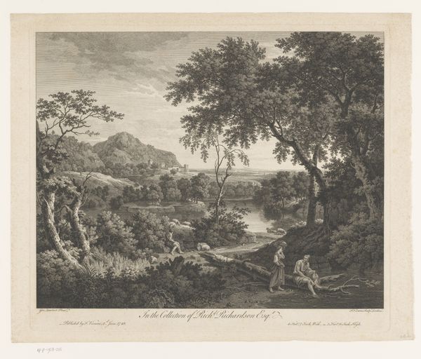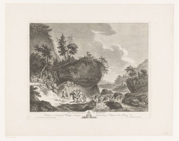 Curator: Here, we have Jacques Bacheley's "Gezicht op Italië," created in 1757. This enchanting piece is rendered as an etching and engraving. Editor: Oh, Italy, viewed from afar! It's incredibly charming, but I get a distinct melancholic vibe. Like a dream viewed through aged lace. The scene feels staged, doesn't it? Curator: Interesting. Formally speaking, observe how Bacheley meticulously structures the composition. The division between light and shadow, particularly in the cliffs and the bodies of water, guide our focus, and that use of contrast surely serves to elevate its intrinsic beauty. The scale feels intentional, emphasizing the dominance of the land over mankind. Editor: Yes, you see the imposing land—I see the subtle comedy in it. Tiny people herding sheep with exaggerated importance beneath the romantic ruins and dramatic clouds. Like actors in a theatre—posing in contrast to the natural splendor of this gorgeous location. A faint critique of humanity perhaps? Curator: Such interpretations might dilute the understanding of his formal intent, but perhaps. Consider how the medium of engraving lends itself to linearity and precision, shaping the entire artwork into a network of distinct forms, rather than dissolving into one homogenous vista. Editor: Indeed, but look at that detail on the sheep and the distant architectural flourishes – those imperfections! The rough edges against that clean line; it is that juxtaposition which captures my imagination. What if we look for hidden patterns, codes that echo Bachley’s soul, and that's where its true beauty comes shining through. Curator: It is, I confess, a delightful interpretation that adds another facet to its timeless appeal. A successful intersection of form and the unfathomable touch of something truly original, perhaps even immortal. Editor: Precisely. A testament to seeing the familiar with newly inspired eyes.
