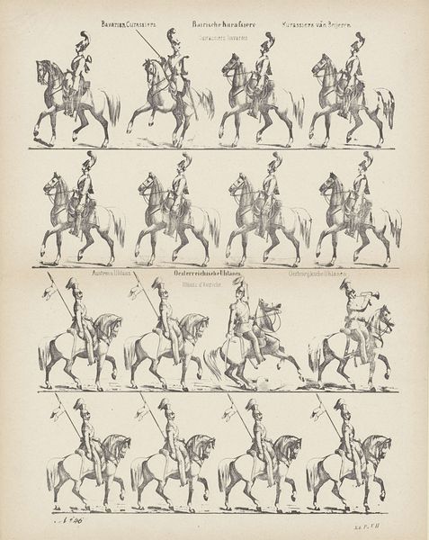 Editor: Here we have "Militairen," possibly from between 1700 and 1865, attributed to van der Haeghen and held at the Rijksmuseum. It's an engraving or print, showing many small figures of soldiers, almost like a chart. I'm immediately struck by its diagrammatic nature. What historical narratives are embedded within this piece? Curator: Precisely. This work, with its almost scientific presentation of military figures, begs us to consider the role of power and representation. Each figure, meticulously rendered, signifies a specific rank or role within the military hierarchy. Consider how these images, likely disseminated as prints, contributed to a particular construction of military identity. Editor: So, beyond just documenting military roles, it's actively shaping perceptions of them? Curator: Absolutely. Think about the period this potentially comes from – a time of near constant conflict. How did visual representations like this influence public opinion about war and soldiering? Are these idealized portrayals? What societal messages about patriotism and duty are being communicated, and to what end? Editor: That makes me wonder about who the audience was meant to be. Was it meant for military training or broader consumption? Curator: That's key! Was this intended for internal military use, solidifying roles and duties, or was it meant to impress or even intimidate a civilian population? Consider how these images were circulated and consumed. How might it have affected people excluded from that structure? Editor: Seeing it as more than just a historical record really changes my perspective. It becomes a statement about societal power. Curator: Exactly. The visual language used here perpetuates certain ideals about gender, class, and national identity. By analyzing its circulation, we can better understand its historical impact and relevance in our society. Editor: I hadn’t considered that such a seemingly straightforward image could have so much to say about power and control. It's been very insightful.