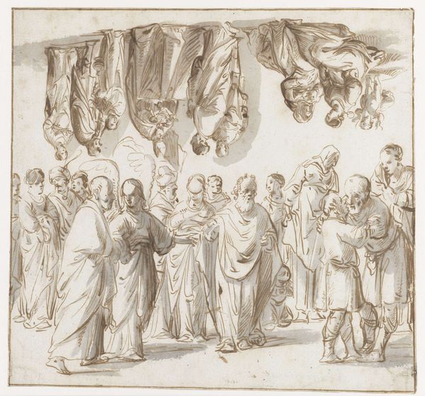 Editor: So, this print, "Jesus-Christ Donnant les Clefs a Saint Pierre," roughly from the 18th century and attributed to Robert de Seri, depicts Christ handing the keys to Saint Peter. It's an etching and engraving, using shades of brown to create a sense of history and gravity. I'm immediately drawn to how theatrical it feels; all these figures frozen in this significant moment. What really jumps out at you when you look at it? Curator: The theatricality is spot-on. It's almost operatic, isn’t it? It's Robert de Seri riffing on Raphael, amplifying the drama. The print isn't just rendering a biblical scene; it's performing it. Look how Seri uses the printmaking medium - those cross-hatched lines to sculpt light and shadow, the deliberate etching...almost reverently echoing Raphael's original. It suggests an elaborate stage, a conscious "historical reenactment" and invites us, no… demands us, to marvel at Peter's divinely-ordained promotion, wouldn't you say? Editor: Yes, I agree it emphasizes Peter’s role. Was it intended to express ideas of the time? The opulence in the rendering feels loaded with meaning. Curator: Precisely! These images, mass produced by engravers, disseminated ideologies. Commissioned often by patrons like Cardinals. It makes one wonder, doesn't it, what keys were these potentates looking to pass on themselves through the work. The Catholic Church had strong social impact at that time. The drama… is that from belief or politics? What do you think? Editor: I never thought about the patrons! It's really a thought-provoking question and adds more context. Curator: Isn't it wonderful to consider the different angles? Seeing this image, that initial feeling of reverence or respect transforms to questioning everything that has come before you. I am sure it means so much to learn at this moment and continue expanding horizons.