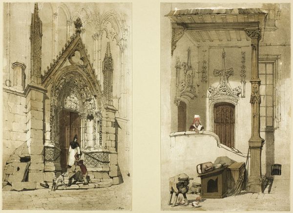 Editor: So, here we have Frederick Nash's "Palace of Justice, Rouen," created with pencil, graphite, and charcoal on paper. It looks like an architectural drawing and almost feels like peering into history through a slightly misty lens. I'm really struck by the delicate details on this massive building. What stands out to you in this piece? Curator: It's uncanny, isn't it? How a few well-placed smudges and lines can conjure such a place! I see a dance between grandeur and the everyday. The Gothic architecture soars, but then you spot the ordinary figures – are they hurrying to court, lost in thought, or simply enjoying a promenade? They breathe life into stone, wouldn't you agree? I can imagine Nash sitting on some steps making marks in his sketchbook and observing what’s unfolding. Does it make you feel that too? Editor: It definitely does! There's a feeling of capturing a moment in time, the past bleeding into the present. Curator: Exactly! The looseness of the drawing lends to that, I think. A photograph is absolute, a pencil drawing has a softness, room for interpretation... almost like memory itself. There's a story unfolding and you are encouraged to imagine and build on what it might be, don’t you think? Editor: I do. It feels incomplete but at the same time full of emotion and feeling. Curator: Yes! Isn’t it marvelous how it invites us in, even today? We're no longer just looking at the building; we are participating in its timeless narrative. What a treasure, really!