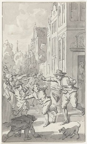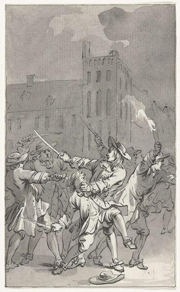 Editor: Here we have "Two Riotous Soldiers Shot Dead in 's-Hertogenbosch by Horsemen, November 1787," a pen, ink, and etching drawing on paper by Jacobus Buys. I'm immediately struck by the chaos depicted – the dynamism of the figures contrasted against the rigid architectural backdrop. What is your reading of the formal qualities here? Curator: Observe first the linear quality that defines this scene, how the precise strokes of the pen and etching delineate space and form. The artist masterfully orchestrates a balance between the foreground action and the background cityscape. How does the tonal range of the ink, from the delicate washes to the intense dark lines, contribute to the dramatic tension? Editor: It’s interesting how the stark contrast really emphasizes the violence and movement. Do you think the artist intentionally used the architecture in this way to enhance that feeling? Curator: Indeed, the buildings’ blocked windows not only provide visual grounding but amplify a sense of confinement, almost as though the drama unfolds within a stage setting. Consider the gaze: the way lines converge toward the central figures heightens the expressive power of the moment. Do you find any recurring visual motifs? Editor: Well, there is a repetition of vertical lines, in the buildings and the bodies, which create a sort of visual rhythm… a bit of order within disorder. Curator: Precisely. This visual cadence, intertwined with sporadic disruptions in the fallen figures, orchestrates the scene's energy, transforming a fleeting moment into a visual concerto of sorts. The materiality itself also needs to be considered: what kind of meaning can be extracted from the artist's decision to use pen and ink rather than, say, oils? Editor: That is a great point. Focusing on the lines allows for conveying quick action with minimal adornment. It allows us to think about what details matter. Curator: Exactly, allowing form and its bare essence to reveal narrative meaning in its starkest and most profound state. Editor: It really changes my perception of the artwork to think about form and composition first. I hadn’t really thought of the architecture having an impact on the feel of this event, other than as a backdrop.