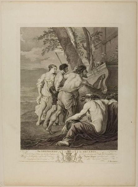 Curator: This engraving presents Pierre Étienne Moitte's "Saint John the Baptist," currently held in the Harvard Art Museums. It strikes me as stark, almost confrontational. Editor: There's an intensity in John's gaze, certainly. The cross becomes not just a symbol but an extension of his will, his unwavering conviction. The two figures behind him seem consumed by doubt. Curator: Absolutely. It is as though Moitte captures the moment of revelation versus skepticism, a timeless human drama. The halo above John confirms his holy status. Editor: The use of line is quite strategic here, isn’t it? The dense hatching in the background throws John into sharp relief. Curator: The artist masterfully uses this technique to highlight John's commanding presence and make him almost tangible. Editor: Indeed. A powerful composition filled with both immediate visual impact and deeper symbolic layers. Curator: Moitte’s work beautifully encapsulates the strength and purpose residing within the figure of Saint John. Editor: A compelling study in contrasts, leaving a lasting impression about faith, doubt, and conviction.