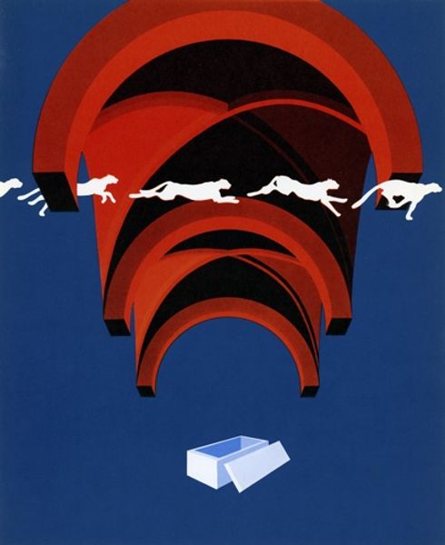 Curator: This is “Saga,” a 1927 graphic poster designed by Cassandre, an important figure in the Art Deco movement. What strikes you first about this image? Editor: Well, immediately, I'm struck by a feeling of austere power, a machine age aesthetic. The sharp, clean lines are hard to ignore, especially within the broader context of interwar economic recovery in France and its imperial connections. Curator: Indeed, the composition is carefully calibrated. Note the dynamic interplay of geometric forms: the stark black hull of the ship, the precise cuboids representing cargo… the visual language emphasizes order, efficiency, and progress. Editor: Yet that progress comes at a cost. The words "Algerie, Tunisie, Maroc" painted on the cargo…these weren’t simply destinations, they were sites of colonial exploitation, linked by the very shipping lines that this poster is advertising. That stylized ocean with uniform lines is hardly innocuous when viewed through the lens of imperialism. Curator: While it's true those geographical names have those implications, Cassandre's formal choices demonstrate something further. Observe how the muted, earthy tones of the cargo contrast against the steely blue sky—it’s about directing our eye and creating visual depth through color theory and geometry. Editor: But to separate form from the geopolitical realities encoded within those destinations feels, frankly, like a dereliction. Even the font, while undoubtedly stylish, carries the whiff of power structures, suggesting control, an imperial gaze imposed upon North Africa. Curator: What you read as control, I see as rationalization, an attempt to aestheticize industrial labor. Consider the simplification: the figure atop the ship reduced to a mere silhouette. All elements coalesce into an undeniably striking whole. Editor: It is undeniably powerful, a well-constructed example of commercial design. However, its beauty cannot distract from the underlying economic realities it represents – a reminder that progress for some is so often built upon the exploitation of others. Curator: Perhaps. Yet examining how Cassandre utilizes visual components in such a deliberately clean and modernist structure gives insights into that aesthetic appeal, helping us to decipher how viewers in the 20's, and viewers today, have interacted with images of the machine age. Editor: And understanding that aesthetic allows us to engage more fully with the fraught relationship between the modern and the colonial, understanding these vectors as both historical conditions and material consequences.