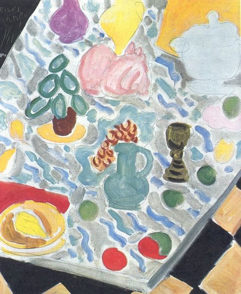 Benny Andrews made this collage, Thurst of Life, from paper and fabric on illustration board. It feels like Andrews is improvising, composing directly from the materials. This kind of immediacy reminds us that artmaking is a conversation with materials, a real time negotiation between hand, eye, and thing. The texture is so varied, isn’t it? The vase is just this simple, flat piece of paper, but look at the flower on the left. Notice the blues layered into it? It gives the flower depth. And the fruit on the table—each one is a little world, with its own patterns and colors. It is tempting to reach out and feel it! The orange tabletop is inviting. See the dark lines running through it? Andrews’ work reminds me of Romare Bearden, who also used collage to create these lively, fragmented scenes. Like Bearden, Andrews is making a statement that embraces multiple perspectives. It's about seeing the world in a new, vibrant way. It's about the thurst of life, right?