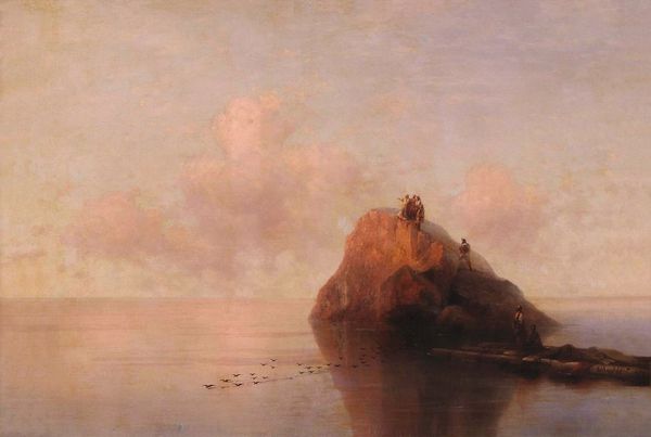 Editor: So, here we have what appears to be an oil painting called "Perce Rock, Belle Isle Straits" by William Bradford. I'm struck by its somewhat ominous, brooding feel. The light feels concentrated on that central rock formation, almost like a beacon in a stormy sea. What stands out to you most when you look at this, like, what does your gut tell you? Curator: My gut tells me a story! This isn't just a landscape, it’s a mood, a feeling – a soulscape, perhaps. I see the Hudson River School influence writ large – a kind of Romantic idealization, almost yearning, for the sublime in nature. Notice how Bradford contrasts the rough, almost primitive textures of the rock with the smoother surfaces of the water and sky? He’s playing with our perceptions, hinting at something deeper than surface beauty. It’s nature as both beautiful and untamable, which Bradford seems to have explored extensively, and what's more romantic than the untamable? Editor: I can see the romanticism there, absolutely, that untamable quality…but doesn't it feel a little bit staged or heightened? Curator: Absolutely! I think you’re right to sense a degree of drama, of deliberate composition. These artists weren’t simply copying nature, they were interpreting it, shaping it, loading it with meaning. Do you see any symbolism that catches your eye? Is Bradford offering us a warning? A challenge? Maybe the rock *is* supposed to feel theatrical. He wants us to feel something larger than life. Editor: That’s a perspective shift, thinking of the painting as aiming for a specific feeling, and creating theatre. Makes you look beyond just representation of the scene. Thanks. Curator: My pleasure, now that my "theatrical" metaphor has got me thinking: all the world's a stage, indeed!