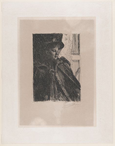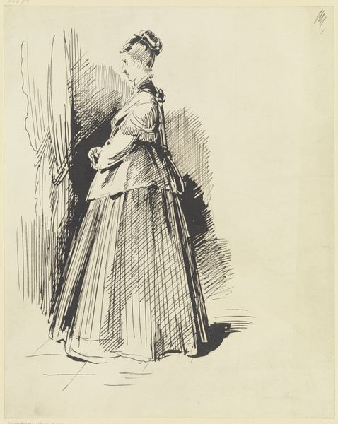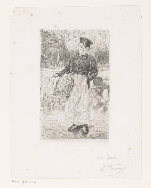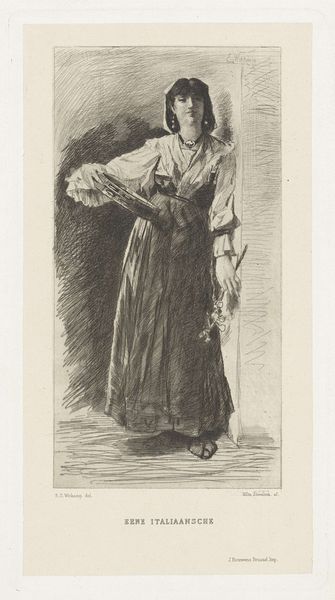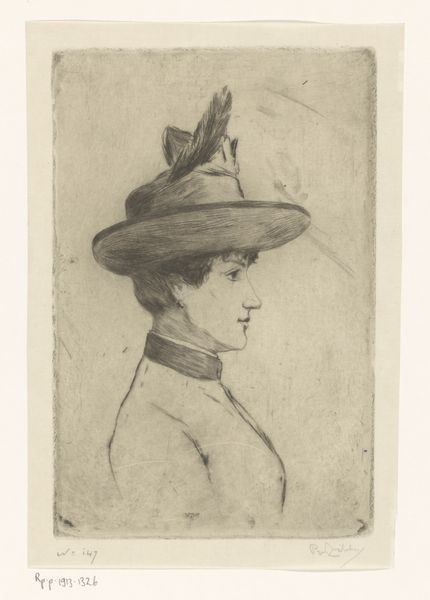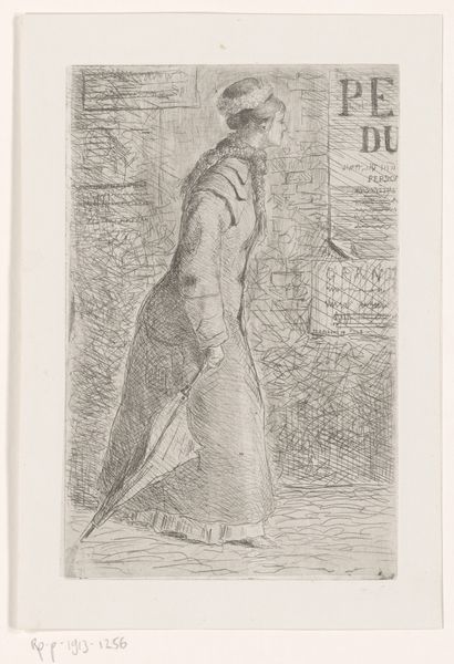 Editor: So, this etching is "Wandelende vrouw met paraplu," or "Woman Walking with Umbrella" created before 1879 by Philip Zilcken. It's at the Rijksmuseum, and the first thing that strikes me is how… ordinary it feels? Like a fleeting glimpse of everyday life. What do you see in it? Curator: The very ‘ordinariness’ you identify speaks volumes. Zilcken captures a moment of public life increasingly accessible in the late 19th century. Consider the rise of the flâneur, often male, observing city life. Zilcken gives us a female figure, active in that same space. Does she partake in the flâneur's detached observation, or does she move with more purpose, necessitated by her role in society? Editor: That's interesting! I hadn't thought about the social role of women in public spaces back then. It makes me wonder where she is going, and what kind of access she has. Curator: Exactly. The umbrella itself can be interpreted as a shield, both from the weather and the male gaze. Etchings, as readily reproducible prints, also played a significant role. They made art accessible beyond the elite circles, reflecting and shaping broader public taste. Editor: So it’s almost a double layer of accessibility: the subject matter itself depicting an accessible public life, and the medium, etching, allowing wider distribution of the artwork. I wonder, was this artist and artwork a success? Curator: Zilcken was well respected, but not considered a leading figure. It's vital to understand that the institutional support - the museums, the salons, the critics - privileged certain narratives, often marginalizing women artists or those who focused on quotidian subjects. Art history, much like society, had its own power dynamics. Editor: That makes so much sense. It’s important to think about how art history itself shapes what we see and value. Thank you for your insights! Curator: A valuable lesson for us both! Always question whose story is being told, and whose is being left out.