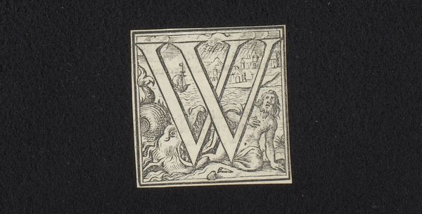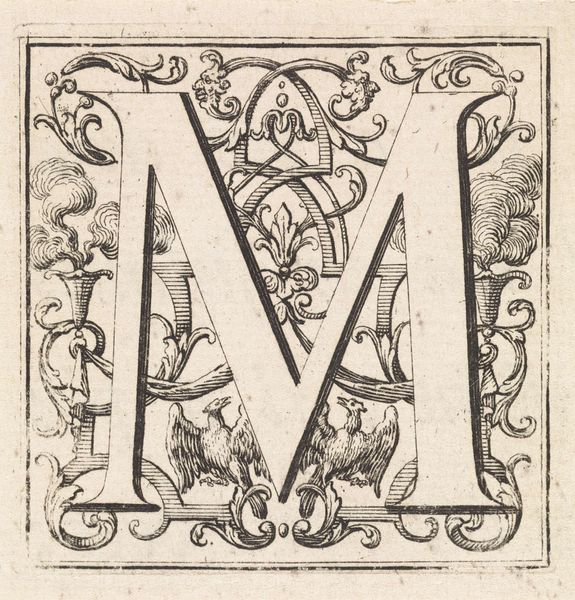 This is an initial letter 'V' with putto, made with ink on paper by an anonymous artist. At first glance, the composition is dominated by a symmetrical arrangement, the letter 'V' acting as a clear, structural form. The stark contrast between the black ink and the white of the paper creates a bold graphic quality. The detailed ornamental designs intertwine with the letterform. This interplay blurs the boundaries between text and image, challenging our traditional understanding of reading and seeing. Look closely at the figure of the putto; positioned centrally, it disrupts the rigid structure of the letter and the surrounding floral motifs. Here, the artist introduces an element of dynamism, destabilizing the overall design through the figure's active pose. This visual tension between order and chaos invites us to question the artwork's intended function, whether decorative, symbolic, or perhaps even subversive. The initial is not merely a letter but a field of endless interpretations.
