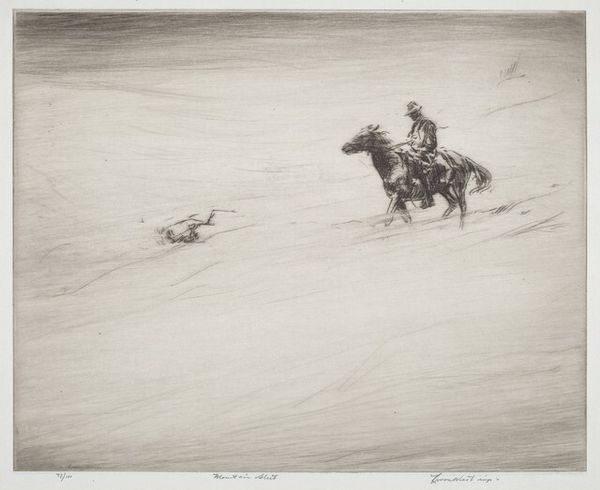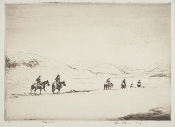 Levon West made this print, High Pass, Canadian Rockies, sometime in the first half of the 20th century. It depicts a group of travelers crossing a snowy mountain pass on horseback, dwarfed by the vast landscape. In the early 20th century, there was a growing interest in the North American landscape. As railways expanded westward, artists, photographers, and writers sought to capture the sublime beauty and untamed wilderness of the Canadian Rockies. Prints like this one catered to a growing market for images of adventure and exploration. West's emphasis on the smallness of the figures relative to the natural environment speaks to the sublime in nature. The image also evokes a sense of the frontier and the rugged individualism associated with the Canadian West. To better understand West's motivations, we might look at the exhibition histories of galleries that championed landscape art in this period, as well as the cultural and economic factors driving tourism and settlement in the Canadian Rockies. Art is always bound up in the social and institutional contexts of its time.