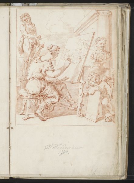 Curator: Jacob Toorenvliet created this ink and pen drawing around 1701; it is titled "Gewonde soldaat voor een tentenkamp," or "Wounded Soldier Before a Tent Camp." Editor: It strikes me as raw, urgent almost. The red ink gives it an immediacy, like a sketch from the battlefield itself. Curator: The artist's hand is definitely present, isn't it? You see it in the quick, confident strokes, the layering of the ink to create depth. Consider also the physical and social circumstances surrounding its creation. Drawings like these often served as preparatory sketches for larger history paintings or prints, and the workshop's means for creating these would heavily impact the availability of the end product. Editor: Yes, and look at the dynamism! The central figure in the helmet gestures dramatically, connecting with the group of figures clustered in the background. The use of line directs the eye immediately towards him. What about the arrangement of light and shadow—or rather, the *suggestion* of it, given the medium. Curator: I would argue that suggestion itself is powerful, precisely *because* it mirrors how art itself mirrors our history, using its methods to create and propagate versions that suit specific people. Think about how drawings circulated – passed between artists, sometimes reworked, eventually making their way into albums, their meaning evolving through varied forms of cultural exchange and consumption. Editor: Absolutely. There is an underlying structural clarity, with strong diagonal lines converging near the fallen soldier, organizing chaos to express intense drama. Curator: Which also reflects the specific materiality of military campaign. Everything in Toorenvliet's image is rendered within a camp where the production and consumption of resources like fabric or pigment were critical to military logistics. This creates a narrative illustrating human conflict and artistic production. Editor: I see what you mean! A compelling tension emerges between the scene's narrative and technical choices that highlight suffering while demonstrating extraordinary artistic skill. Curator: Indeed. Exploring the confluence of materials, methods, and societal functions expands our grasp of not just art, but history, culture, and humanity itself. Editor: A fitting note. This quick sketch delivers an expansive vision.