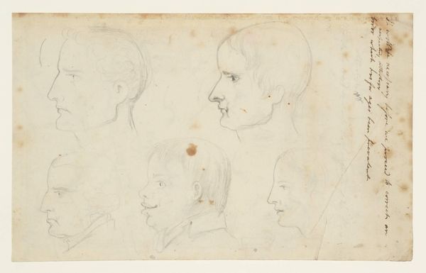 Curator: This fascinating sheet of studies is titled "Sketches of Male Profiles, Couple Embracing," attributed to Thomas Stothard. It's an undated work held here at the Art Institute of Chicago, executed in graphite, likely pencil, on paper. Editor: There’s something haunting about it. All those faces in profile, gazing into the distance… It feels like a study in melancholy, almost a lament. Curator: Absolutely. Considering Stothard’s likely reliance on readily available graphite and paper, it underscores the democratization of artistic creation in his era, moving away from costlier materials. We also see the use of accessible printmaking, reflecting growing industries. Editor: But what about the imagery itself? Profiles, of course, historically signified power, especially on coins and in portraiture. Here, though, they’re vulnerable, exposed. The embracing couple at the top... do they represent comfort, loss, a romanticized past? Curator: The contrast in linework interests me – very precise outlines adjacent to looser sketching suggests that perhaps this sheet held many purposes for the artist within the studio, a valuable resource for his shop's work. Editor: It speaks to the duality inherent in Stothard’s work, a negotiation between accessible imagery and enduring symbolic weight. This speaks to an artist attempting to explore and reflect profound emotion during times of political turbulence in Europe. Curator: That blend of accessibility and complexity shaped not only Stothard’s production, but his reception among wider audiences; considering how the studio functioned gives more insight than attributing a unique "meaning". The studio practices also influenced later workshops by apprentices. Editor: True, by focusing on the repeated symbols and figures in the history of art, we begin to appreciate the deep and intricate web of visual language. It makes one reflect on shared experiences in the collective subconscious, particularly what we might associate the face with –identity, memory, presence. Curator: Analyzing the medium and process allows us to re-evaluate that relationship, revealing new details about labor practices within 18th-19th century commercial studios. Editor: I’ll never see pencil sketches in quite the same light again! Curator: And, hopefully, you'll continue to question established meanings about what these sketches represent, and perhaps reconsider our conventional focus on artistic meaning!