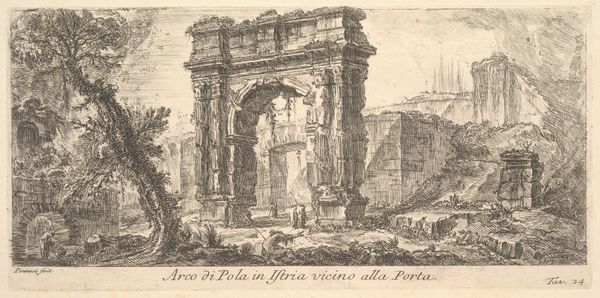 Giovanni Battista Piranesi created "Plate 21: Temple of Pola in Istria" using etching, a process that involves using acid to cut into a metal plate. Piranesi lived in a time when Europe was deeply interested in its classical past. Piranesi's work exists in the space between documentation and imagination. It highlights Europe's colonial gaze and the power dynamics inherent in how cultures perceive one another. The artist, in his own words, sought to "introduce a greater magnificence" into his architectural views. What does it mean to enhance ruins? Is it an act of preservation, or does it speak to a desire to dominate and idealize history? Notice the figures that populate the scene. Their presence emphasizes the scale of the temple but also suggests a narrative. They seem to be visitors or perhaps locals, interacting with the ruins in a way that bridges the past and present. Piranesi's etching invites us to reflect on how we engage with history and the stories we tell ourselves about the rise and fall of civilizations. It encourages us to consider whose perspectives are included and excluded in these narratives.