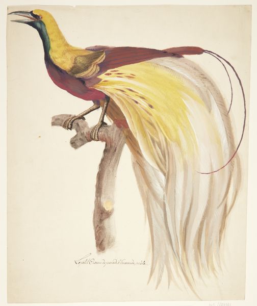 Curator: Here we have "Exotisk fugl" which roughly translates to "Exotic Bird", an artwork from the period 1799-1860 by Johan Christian Ernst Walter. It combines drawing, gouache, and watercolor on paper, a fascinating mix of mediums. Editor: Well, hello there, Mister Fancy Pants! My first impression? A majestic bird who just styled its feather boa and is ready for a night at the opera. The plumes cascading down look like inky violin strings—ready to play a symphony! Curator: Precisely. The composition utilizes a relatively subdued color palette save for that splash of turquoise. It creates a textural richness; observe how the watercolor is layered to give the feathers both weight and ethereality. Note also the meticulous detail in rendering the bird's form. It invites a semiotic reading regarding exoticism and nature. Editor: "Semiotic reading?" Is that what you call staring really hard until the picture tells you its deepest secrets? Kidding! But seriously, for me, there's something so wonderfully… theatrical about it. The long plumes, the perched pose – it is like the artist captured the essence of a creature that's aware of its own magnificent display. Also there's something romantic about how even though so realistically painted, its hard to separate it from being some strange imaginative spirit or figure from a fable or fairytale. Curator: Yes, I concur on its theatrical nature which aligns itself aesthetically within the naturalism and romanticism prevalent at the time. It’s like the artist wished for something of a grander stage. Editor: True! The very definition of flamboyance framed in watercolor. A delicate dance of artistry that lets you believe anything is possible with a dash of color. Even that a bird can go to the Opera. Curator: Indeed. The artist prompts us to reassess our aesthetic relationship with nature through these strategic artistic deployments. Editor: Okay, professor, even I have to say…well observed! I might add that sometimes all art requires is for someone to dream, really really vividly... and for us to just let it soak into our minds!