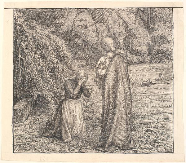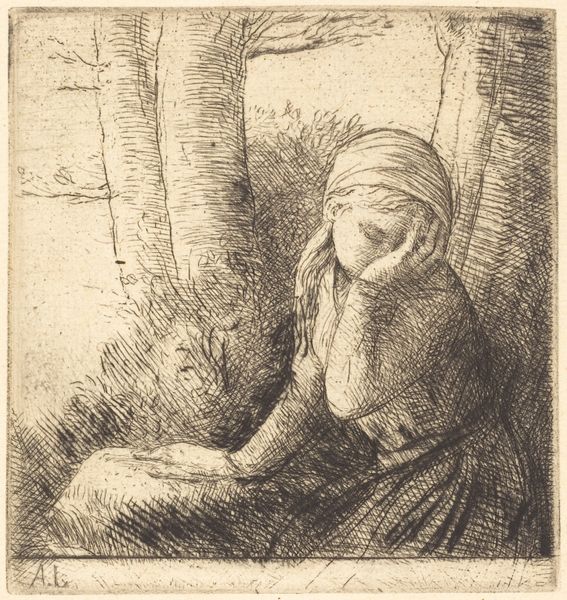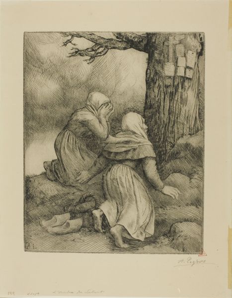 Editor: We’re now looking at Alphonse Legros’ print, "Woman at the Foot of the Cross," done in etching. There’s something intensely somber about it, the figure seems utterly alone. How do you interpret the social and cultural elements at play here? Curator: This image, etched with stark lines, draws on a long history of representing mourning figures in Christian iconography. Legros, though working in a period of increasing secularization, is engaging with powerful visual traditions. The woman, positioned at the foot of the cross, becomes a stand-in for collective grief and perhaps, the diminishing, yet persistent influence of the church in daily life. Consider where this would be displayed – perhaps not just in a religious setting. Editor: So, its meaning isn't just religious? Curator: Not exclusively. Think about the social function of art in the late 19th century. Prints like this, relatively affordable, circulated widely. They became a way to grapple with universal themes of suffering and loss outside the confines of the church itself. What message do you think an artist chooses to create at a moment where art enters popular consumption? Editor: That’s a great point. It broadens the appeal. What about the etching technique itself? How does that relate to the social meaning? Curator: Etching allowed for the creation of multiple originals. It democratized image production to some extent. Furthermore, the starkness and the visible labor inherent in the etched line lends a sense of gravity and authenticity to the scene. Legros isn't just depicting sorrow, he's performing it through his meticulous process. Editor: This has given me a whole new way of seeing how the artist connects the artwork, the viewer, and broader cultural narratives. Curator: Precisely! The political landscape of art includes the technique itself, doesn't it?