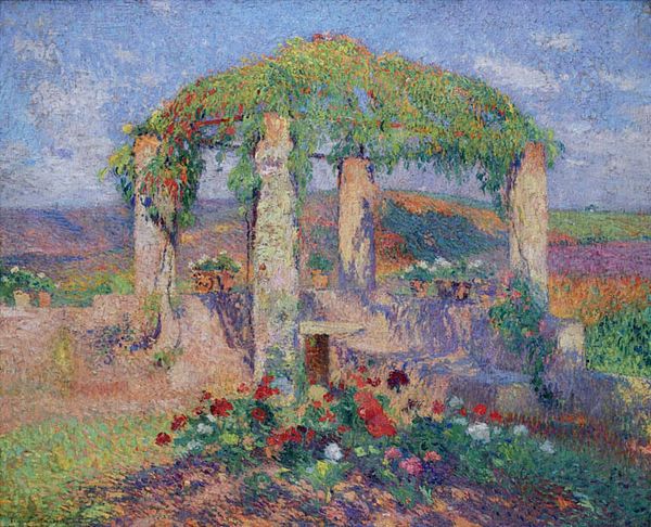 Editor: So, this is “The Gloriette” by Henri Martin. The medium appears to be oil paint, and it definitely gives off very serene, calm vibes. All those little dots create an image that almost shimmers, which I find mesmerizing. I am drawn into the geometric form of the Gloriette itself in contrast with the very organic feeling of the painting, though. How would you describe your impressions? Curator: I find it really sings of stillness, a quiet hum of life. Look at how the light filters through the leaves – it's not just representation; it feels like an experience, almost tactile. Neo-Impressionism, in its core, tries to dissect how we perceive colour, how our eyes and minds create the whole. Martin’s use of the technique here feels deeply personal. I'd venture he sought to capture a certain light within himself as much as without. Doesn't that resonate, how a garden can reflect inner landscapes? Editor: It does now that you mention it. I suppose the geometric aspect of the gloriette really helps contain all of those shifting, dream-like emotions. Curator: Absolutely! It gives shape to feelings that are normally formless, perhaps. These shapes provide stability and focus, but there's so much colour in the landscape, you see it everywhere. Have you felt a painting this way? When it almost becomes… alive? Editor: I think I'm starting to feel it now. Curator: Lovely. Each time is a new adventure. Editor: That’s definitely going to stay with me. Thanks!