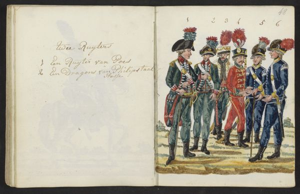 "Verschillende uniformen van Engelse Rangers," or "Different Uniforms of English Rangers," is a watercolor drawing by S.G. Casten. The image depicts six figures in military attire. It is accompanied by handwritten notes that identify each ranger according to their position. The artist meticulously captures the details of the uniforms, from the color-coded plumes atop their hats, which designate rank, to the polished buttons and precisely tailored jackets. This work offers a glimpse into the visual language of power and identity of the time. What does it mean to be seen, to be recognized, to belong? The uniforms create a sense of collective identity, but also reinforce social hierarchies. The artist captures the tension between individual identity and the homogenizing force of institutional dress.