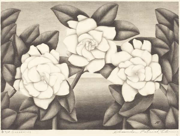 Curator: Oh, my first impression is serenity. There's something so peacefully insistent about those blossoms, wouldn't you agree? Editor: The meticulous detail does foster a certain stillness. This drawing, or perhaps it's a print? titled "Orange Blossoms," rendered by Alexander Patrick Fleming, is quite striking in its composition. The play of light and shadow creates a densely layered yet balanced tableau. Curator: You know, balanced is an interesting way to put it. To me, the density is what makes it sing! Like being utterly enveloped in a secret garden. It's like each bloom whispers, "stay a little longer." Editor: That's a wonderfully evocative reading! Considering the academic and realist styles evident here, perhaps Fleming sought to capture the scientific precision of botanical illustration within a more expressive context. Observe how each leaf and petal is rendered with remarkable accuracy, the light almost sculpted onto the forms. Curator: True! You can almost smell the citrusy air wafting through it. It feels less like objective science though and more like... longing, you know? A longing for that simple perfection we find in nature. Maybe Fleming felt that too. Editor: I see your point. There's a definite romantic sensibility. Though I’d also note the artist’s use of line to articulate the volume and texture, turning naturalistic forms into abstract design elements. What is your take on the dominance of line in "Orange Blossom?" Curator: Ah, the lines! They vibrate with life, like little energy currents humming. Makes you wonder what he was feeling while tracing each tiny curve, each tiny leaf. Editor: It begs us to examine the structural integrity of the design itself, transcending mere depiction. As a method, academic art and realism are mostly at odds: one uses rules for how art can and should function whereas the other adopts an aesthetic based purely on observation. Fleming walks a strange path right between them! Curator: Right? Maybe the space in-between those paths is the sweet spot. After all, real emotion comes from embracing the in-between spaces, doesn't it? Thanks for walking and wondering through this garden of "Orange Blossoms" with me! Editor: Indeed! The confluence of technique, form, and expression here encourages us to linger, analyze, and, perhaps, glimpse something fundamental about representation.