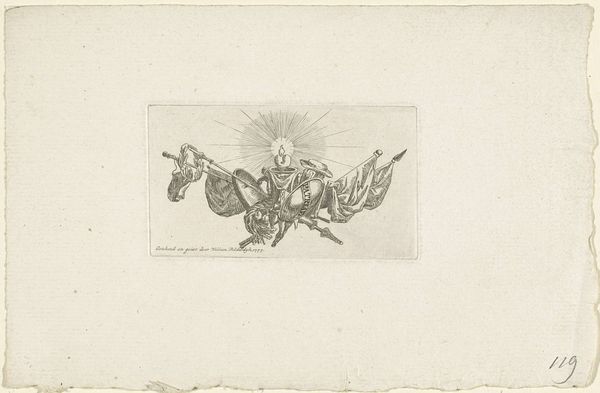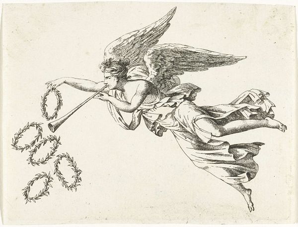 Curator: This etching, “Fame,” dates back to 1649-1650. It’s by Stefano della Bella, and resides now at the Metropolitan Museum of Art. Editor: Whoa, she's really beltin' it out, isn’t she? A little hard to see her with those light strokes, but…is that, like, raw ambition blasting through a Baroque megaphone? Or maybe I'm just projecting. Curator: Well, allegorically speaking, the figure *is* Fame. Notice how she's winged, how the wind catches her drapery? These are visual cues indicating swift movement, boundless reach. She's omnipresent, and carries her message far. Editor: Sure, omnipresent. All I'm seeing is slightly out-of-breath and trying to look important. The trumpet helps. It adds drama, though the wings, in this hazy light, make her seem like a frantic moth. Curator: I see a bit more. Trumpets in art historically symbolize pronouncements and declarations. Here, that might tie into themes of social recognition and memory—the recording of achievements. What strikes me is the Baroque flair—the dynamic pose, dramatic light… Editor: Baroque does bombast better than most. The delicacy of line for an etching—it's beautiful, that careful detail, the way the folds cascade…makes me wonder what the honk of ‘Fame’ really sounds like. Is it fanfare or just static? I suspect something more nuanced is being hinted at here. Curator: Perhaps Bella intended to provoke that ambiguity. Fame itself is rather slippery. What gets remembered, and *why*... it all carries this fascinating, mutable weight across history. Editor: Totally. A whisper, a shout... either way, someone is left doing the shouting. So next time you're puffing your own horn—imagine our friend here: equally earnest, equally lost in her task, flapping furiously against an indifferent sky. Food for thought. Curator: Indeed. It also prompts reflection on what, in the present day, has supplanted those historical ideas, images, and allegories. Editor: Right? Like, who even blows trumpets about 'fame' anymore? Is that just internet noise these days? Or a meme? It feels so dated now, that trumpet lady! But in the best possible way, obviously.