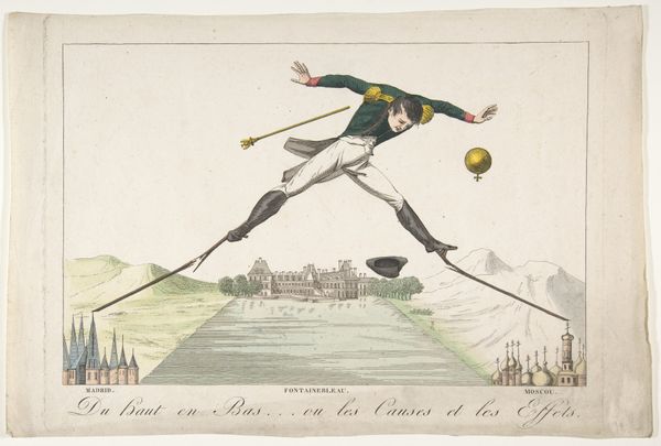 Curator: This etching, dating back to 1815, is titled "Gone with the Wind," or "Autant en emporte le vent." Editor: It's quite evocative! I'm immediately struck by the chaotic composition and almost farcical presentation. Napoleon seems to be swept away by a literal "wind" – a rather unflattering one at that. Curator: Precisely. Its a satirical take on Napoleon’s downfall, referencing the retreat from Russia. We see the "Wind" personified with his hair. Consider also that printmaking served as a potent means of circulating political commentary during this period. Editor: Absolutely, and looking at the technique itself—the etching feels immediate, almost rough. Not something labored over, but rather produced quickly, perhaps to respond to an evolving political climate. The lines are coarse, and you can really see the hand of the artist at work. Curator: That is accurate. The hasty execution amplifies the sense of urgency and the chaotic nature of Napoleon’s situation. The discarded crown and papers scattered around suggest the crumbling of his empire. Editor: Those papers – you can almost see the hasty scribbles upon them. Likely declarations and decrees rendered meaningless by defeat. What paper and inks were typically employed in satirical prints such as these? Curator: Given the socio-political climate, they likely would have utilized cheap readily available material. The medium facilitated a broad dissemination among the French population, becoming instrumental for public discourse. Editor: It underscores the role of art as a witness – and as a tool, doesn’t it? A means of recording history not through grand, heroic paintings, but through quick, biting satire aimed at immediate consumption. I find the interplay between the content and method truly fascinating. Curator: And it invites reflection on the way in which figures of power can become figures of ridicule through art. Editor: Indeed. This satirical print reminds us that even grand empires are subject to the whims of circumstance and the power of popular opinion expressed through readily accessible materials.