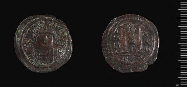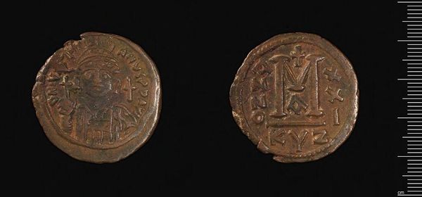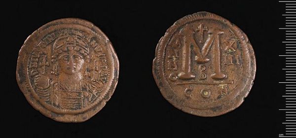 Editor: This is a bronze coin of Justinian I. It's pretty beat up, but I can still make out the emperor's face on one side and what looks like a large "M" on the other. What do you make of it? Curator: The imagery on this coin speaks volumes. Consider the emperor's depiction – haloed, armored. These aren't just identifiers; they're potent symbols. What sort of message do you think Justinian intended to convey? Editor: Power, maybe? The halo makes him look almost divine. Curator: Precisely. And the "M" is a numeral representing the coin's value. But consider the cross above it – a symbol deeply entwined with Justinian's reign. The coin isn't simply currency. It's a statement of imperial authority and divine favor, interwoven. Editor: So, even something as small as a coin can be a powerful tool for communication? Curator: Indeed. Symbols persist, shaping collective memory. This coin reminds us how images transmit cultural values across centuries.