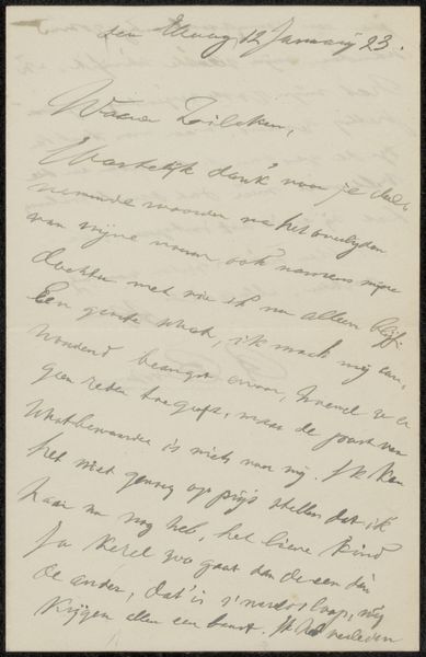 Curator: This appears to be a letter, “Brief aan Philip Zilcken,” created sometime between 1911 and 1930. The piece uses pen and ink on paper and incorporates hand-lettering and linocut techniques. It's got an intimate feel to it, almost like we're peeking into someone's personal correspondence. The handwritten text dominates, creating a very immediate, personal connection. What strikes you about it? Editor: Well, besides the obvious beautiful handwriting, it does have an air of intimacy. The script gives the impression that the author wrote in haste, possibly while sitting outside at a cafe somewhere, with the sun on their shoulders. But from a historical perspective, what might a letter like this tell us about the art world at that time? Curator: That’s a great question. Think about it: correspondence networks *were* the art world in many ways. Before the internet, before even widespread photography of artworks, letters facilitated dialogues. They distributed ideas. Zilcken was himself an artist, critic, and a key figure in connecting Dutch and French artistic circles. This letter, beyond its personal content, represents that vital flow of information and influence. What language is it in, do you know? Editor: It looks like French. So, someone in the Dutch art scene corresponding in French points towards an interesting level of cultural exchange and perhaps a specific audience he had in mind? Curator: Exactly! Consider the social status tied to fluency in French during this period – it signified a certain level of education and cosmopolitanism. The choice of language wasn't neutral. The very act of writing in French positions the author within a specific cultural and intellectual landscape. And what kind of public role can art have when private dialogues can determine the discourse in the art world? Editor: It seems like the art world, then, was built upon these personal connections and shared cultural understandings, accessible mainly to those in the know. Curator: Precisely! Seeing this letter as more than just a personal note allows us to understand the social and cultural fabric of the art world at that time. We often reduce art down to galleries and auctions now, but things were often exchanged like this back then. Any final thoughts? Editor: I think it’s fascinating how a seemingly simple letter can open up such a rich understanding of artistic networks and cultural values of the early 20th century. It’s much more than meets the eye.