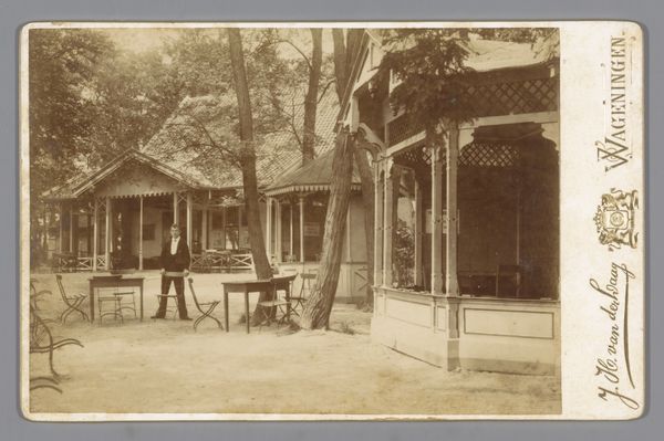 Editor: This drawing, "Bijgebouw op de plantage Gambar te Java" – or "Outbuilding on the Gambar Plantation in Java" – is believed to be from sometime between 1920 and 1924. It's a pencil drawing on paper by Willem Witsen. The soft grayscale lends it a tranquil air, almost like a memory. What strikes you about the piece? Curator: I’m drawn to the composition, particularly the artist's strategic use of framing. Notice how the trees act as a natural proscenium arch, focusing our gaze on the outbuilding. The textural contrast is equally compelling; observe the detailed rendering of the leaves versus the smoother planes of the architecture. It creates a visual push and pull. Editor: It definitely guides the eye, like you said. The detail is so meticulous, yet it retains a sketch-like quality. Was this contrast common in his drawings? Curator: Precisely. The inherent tension within its formal elements makes this drawing visually dynamic. He is presenting not a mimetic representation but an interplay of lines and forms, provoking inquiry of meaning beyond surface resemblance. Consider the pencil strokes themselves – they create gradients of tone that offer form, depth, and atmospheric qualities within the landscape depicted. Editor: So, you are looking more at *how* he represents the scene than *what* he is trying to show. Curator: Yes, exactly. How he leads the viewer through the formal devices such as perspective, light, and even the selection of line and tone is how the subject becomes interesting. Editor: This has provided me a deeper awareness of looking closely. It’s like learning a language just beneath the surface. Curator: Indeed. The value lies not just in recognition, but also in interpretation. Seeing the structures reveals the method that Witsen employed in making his vision visible.