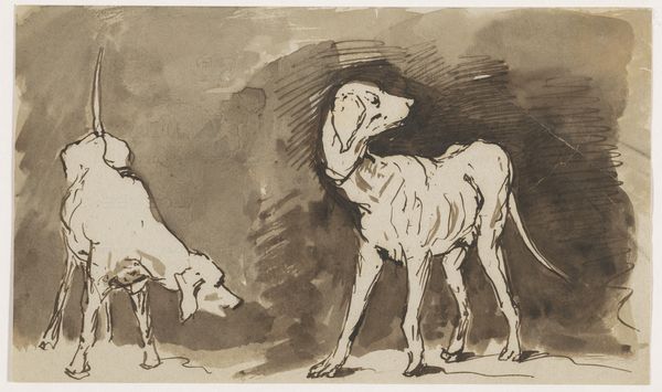 Curator: Here we have Johannes Tavenraat's "Hunting Dog with Hare," created sometime between 1840 and 1880. It's a drawing done with pen and ink, a genre scene rendered in a realist style. Editor: My first impression is how dynamic it feels. The dog's pose is so alert, and the use of line creates a real sense of movement across the landscape. It's a rather stark, yet very powerful, image. Curator: Absolutely. It speaks to the Netherlands’ economic structures and the role of hunting and its symbolic relationship to the relationship of the ruling classes and the people on that land. Look closely, and you’ll notice the seemingly endless horizon— Editor: You know, the composition itself really holds the eye. The artist uses the horizon and cloud shapes to draw you toward the dog. His choice to give such an attention to detail there creates an intriguing tonal and linear relationship. Curator: Which also is a commentary on power dynamics inherent in the act of the hunt itself, really—the deliberate imbalance of hunter and prey mirroring social stratification. I'm also intrigued by the subtext—a study on the colonial enterprise. Dogs are introduced species that changed local environmental. The act of killing the rabbit, with local populations, suggests a similar domination of outside systems impacting and overpowering internal. Editor: An astute observation, and that colonial subtext resonates deeply once you point it out. But regardless of context, the application of ink adds a certain richness. Look how Tavenraat has used these fluid brushstrokes to capture the sheen on the dog's coat. Curator: True, and even those wispy strokes around the clouds offer the work a sense of immediacy. There is an urgent quality in the making that forces a viewer to reconcile this depiction. To me, though, it also suggests themes of fragility. Look at the landscape, and the body of the slain hare; and look back on colonialism's irreversible damages. Editor: It's a delicate balance the artist strikes here. Even though seemingly realistic and pastoral, this is an aggressive action displayed in this innocent style. This has really given me new insight. Curator: It is in the artistic skill to highlight colonial enterprise with a single ink, isn't it? An evocative exploration that certainly demands revisiting.