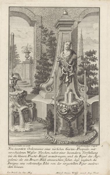 Editor: This is "Fontein met buste van Ceres," a print by Georg Lichtensteger, made after 1724. It's an engraving, and I find the crispness of the lines really striking, especially the way they define the textures of the architecture and the sculpture. What jumps out to you? Curator: Immediately, the engraving's emphasis on line becomes paramount. Observe how Lichtensteger uses the varying density and weight of etched lines to create a sense of depth and volume. Consider the contrast between the meticulously detailed rendering of the architectural framework versus the smoother treatment of the Ceres bust. Does this difference draw your eye toward a particular focal point? Editor: I see what you mean; the darker lines really make the architecture pop, almost framing Ceres. It's like a stage. Curator: Precisely. The architectural elements establish a clear structure, creating distinct planes and geometric forms. Note the archway, the vertical pillars, and the carefully placed foliage. How do these elements contribute to the overall composition and balance of the work? The structural formality of the composition almost mirrors the intended function, of grace achieved through careful observation of symmetry. Editor: The symmetry is undeniable, like the formal gardens in Versailles. It creates a very ordered, almost rigid, feel. Curator: It is this balance, achieved through a careful arrangement of form and line, that truly dictates our experience of the print. The image, through Lichtensteger's considered design, aspires to perfect aesthetic harmony. How does appreciating these compositional strategies influence your perception of the image as a whole? Editor: I didn't realize how much the formal arrangement affected my reading of the image. Now I see the order is not just decorative, but an intrinsic part of the work's meaning. Curator: Precisely. The aesthetic choices, even in print, become key to unlocking deeper understanding.