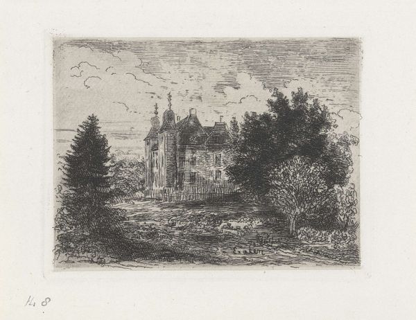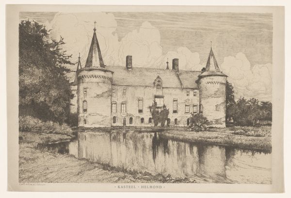 This is ‘Huis Rooswijk’, an etching made by Barthold Willem Floris van Riemsdijk in 1916. Etching involves using acid to cut into a metal plate, which is then inked and printed. In Riemsdijk’s time, this was a well-established medium, deeply intertwined with the rise of capitalism. Etchings could be reproduced in multiples, making art accessible to a wider audience. Notice how the fine, precise lines of the etching capture the architecture and surrounding landscape. The texture of the trees, the reflections in the water, and the details of the building are all meticulously rendered. This attention to detail speaks to the artist's skill and the labor involved in creating the image. The process is labor intensive and demanding. Ultimately, understanding the materials and methods used in 'Huis Rooswijk' allows us to appreciate the skill and effort involved in its creation, and to reflect on the relationship between art, labor, and society.