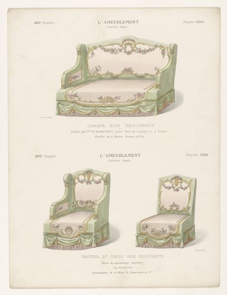 This print by Léon Laroche showcases two chaise longues, embodying the decorative aesthetic of its time. Note the recurring motifs: floral ornaments, garlands, and delicate tassels that adorn these pieces. These aren't merely decorative; they are symbols deeply rooted in the cultural memory, evoking ideals of beauty, fertility, and abundance. Observe how the floral motif, a timeless emblem of nature's bounty, reappears throughout art history. From ancient Roman frescoes to Renaissance tapestries, flowers have consistently symbolized life, growth, and the cyclical nature of existence. Consider the psychological appeal of these designs. The soft pastel hues and sinuous lines soothe the eye, inviting repose and contemplation. Such elements engage the viewer on a subconscious level, stirring emotions and memories tied to comfort, luxury, and refinement. In this context, we see how symbols continuously resurface, evolving and adapting to new eras.