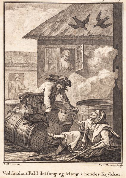 Curator: Here we have "Interior with a Woman Reading a Letter," a 17th-century engraving from Justus van den Nijpoort. Editor: It's instantly captivating. The textures, despite being printed, feel tangible—rough wood, aged brick, and the smoky haze that seems to cling to every surface. Curator: Van den Nijpoort, while lesser-known today, operated within the vibrant context of the Dutch Golden Age. His prints provide valuable glimpses into the domestic lives and social dynamics of the period. The depiction of a woman reading, or perhaps receiving news, offers a potential focal point for examining gender roles and literacy. Editor: Yes, and look how skillfully he manipulates line to define form. The cross-hatching builds depth, while lighter touches convey a sense of airy space. Semiotically, the letter itself is heavy with meaning. Is it correspondence with a far-off lover, a business proposal, a note from a friend? The possibilities are intriguing. Curator: Given that the woman seems to be the central focus, it would be fascinating to understand the power dynamics within this interior. The men gathered around the table—do they have a say in what is being communicated to this woman, and how does their presence define her existence? Her actions must always occur within the purview of societal standards. Editor: Consider the objects placed meticulously within the composition: The carafe hints at convivial indulgence, the pipe—smoldering softly—points towards moments of introspection, perhaps hinting at hidden depths. Notice, also, the simple arrangement, with a composition that focuses around this central table. Curator: Absolutely. In terms of socio-historical context, objects themselves carry cultural weight. Access to writing materials, levels of literacy, leisure time to drink. What did the existence of the working classes look like? Editor: Nijpoort invites the viewer to question the subtle visual cues. These visual details give us context and create meaning. Curator: And it also shows the ways gender, race, class and privilege have always been central considerations in life. This piece of art history helps us engage in contemporary theories, and vice versa. Editor: Exactly, from the detailed hatching to the way that the room’s lighting seems to be defined, the impact here feels intensely lived-in and thought-through. Curator: Thinking through these different interpretive frames really allows the past to inform our present.