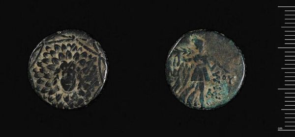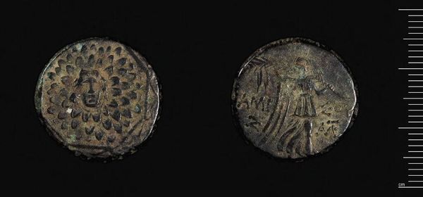 Curator: Here we have a silver coin from Amisos in Pontos, issued by Mithradates VI Eupator. Its worn surface evokes a sense of tangible history. Editor: My eyes are drawn to the face surrounded by what looks like a field of dots. A powerful image, evoking fertility and abundance. Curator: Indeed, the field around the ruler's face could be a diadem, symbolizing royal authority. The imagery conveys a sense of power and legitimacy, linking the ruler to divine favor. Editor: It's incredible to consider the labor, the physical act of striking the coin, circulating it through the kingdom. The silver itself would have been mined, smelted, and traded—a complex network of human effort. Curator: Absolutely, and Mithradates VI skillfully used these symbols to craft his image. It's fascinating how such a small object can carry so much cultural and political weight. Editor: I'm left pondering the many hands this coin has passed through, the transactions it facilitated, and the stories it silently witnessed. Curator: A perfect reminder that even the smallest of artifacts can reveal the grand sweep of history.