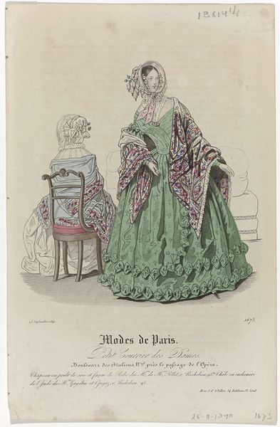 This fashion plate, titled 'Petit Courrier des Dames', was printed in 1836, likely using a combination of engraving and hand-colouring, processes common for disseminating fashion trends. Look closely, and you'll notice how the print meticulously represents the textures and details of the garments. The bonnet, dress, and floral fabric are all described in detail, with careful attention paid to the folds and drapes of the cloth. These designs would have relied on skilled needleworkers, dressmakers and textile artisans. The entire ecosystem of the fashion industry, from designers to retailers, depended on the labor of countless individuals. Fashion plates like these played a crucial role in shaping consumer desires and driving the production of textiles and clothing. They highlight the complex relationship between art, commerce, and social aspirations in the 19th century. Recognizing the labor and industry implicit in this image allows us to appreciate the artistry and the broader social context that gave rise to it.