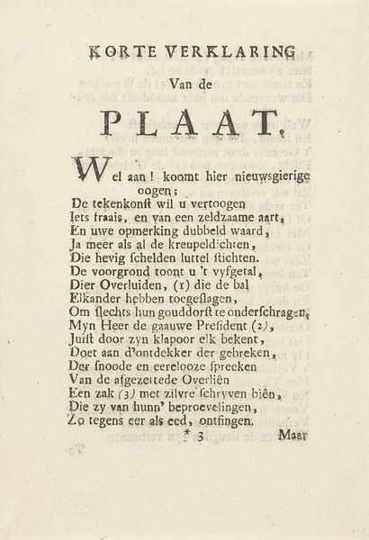 Curator: Isn't this just delicious? It’s a print from 1683 or 1684 called "Vers bij de spotprent met Theodorus Dominicus die op een kruiwagen de kerk in wordt gereden" or, "Verse to the caricature of Theodorus Dominicus being driven into the church in a wheelbarrow.” Editor: Immediately, I’m struck by the crispness of the text, like it was printed yesterday. There's a beautiful clarity in its graphic design, even though it feels centuries removed. Curator: It's a broadside, meant to be distributed widely and quickly, commenting on a very specific moment in religious politics. Think of it like a meme from the Dutch Golden Age. The print references Theodorus Dominicus, who was a controversial preacher at the time. The “Kruiwagen”, the wheelbarrow in the title, became symbolic of the conflicts within the church. Editor: It’s interesting to see how religious tensions manifest in popular imagery. You almost get a sense that religion in the public sphere became something to joke about. Given the small lettering, it feels meant to be consumed privately, for those in the know. What do we know about its production? Curator: It was printed in Leiden by Teun Tomisse. The inclusion of the printer's name indicates the growth of print culture at this time. You know, the accessibility of this type of print allowed for a rapid dissemination of ideas that certainly shaped public opinions in interesting ways. The text itself, the “verse”, offers commentary on Dominicus’s situation and the divisions in the church. Editor: I love how these seemingly ephemeral, inexpensive prints offer glimpses into the passions and the anxieties of a specific time and place. It shows us that these religious arguments had real-world, material impacts. In the digital age, one wonders what physical documents might outlive this moment, capturing our shared, evolving sensibilities. Curator: Agreed. There is so much in just one little page. A real time capsule of ink and intrigue.