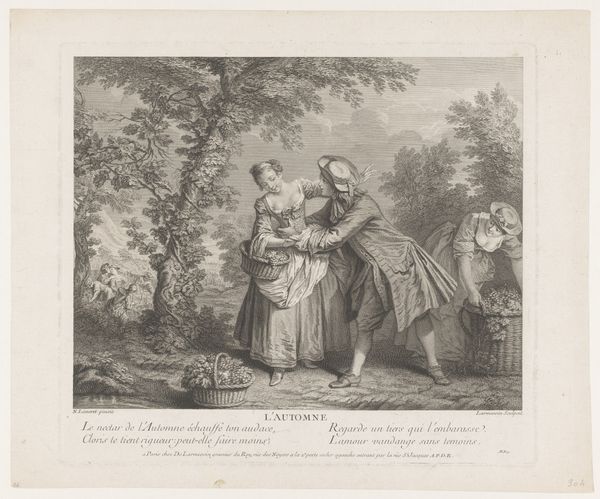 Editor: This engraving, "Herdersfamilie in een landschap," probably made between 1747 and 1812 by Pellegrino dal Colle, depicts a shepherd family in a landscape. It gives off this old-timey, baroque vibe. The central figure seems so detached. What do you see in this piece, from your perspective? Curator: I see a highly constructed image perpetuating a romanticized, and frankly, false narrative about rural life. This isn't a snapshot of reality but an ideal, likely catering to an elite urban audience longing for a simpler time. Note the carefully arranged figures, the implied leisure, even the cleanliness – this belies the harsh realities of 18th-century agrarian existence. Where is the toil? The poverty? The disease? It's absent, sanitized. What do you think this absence says about the intended audience and the social function of this image? Editor: So, it's less about showing life as it *is* and more about telling a specific story, for a certain audience, perhaps about their values and what they wished for? I hadn't really thought about who *wasn't* in the picture. Curator: Precisely. We have to question the power dynamics inherent in representations like these. Who gets to tell the story, and whose voices are silenced? Consider the composition – who is centered? Who is relegated to the periphery? This isn’t just about art; it’s about social hierarchies and the perpetuation of dominant ideologies. What’s your feeling now about that central figure? Editor: Thinking about it, her ornate clothes and pristine appearance now stand out to me, really reinforcing the artificiality. It feels much more staged than at first glance. Thank you for providing an interesting lens for looking at this piece! Curator: And thank you for engaging with the work critically. These types of engravings can tell us much more about the era, when we look for what is *not* visible as well as what is.