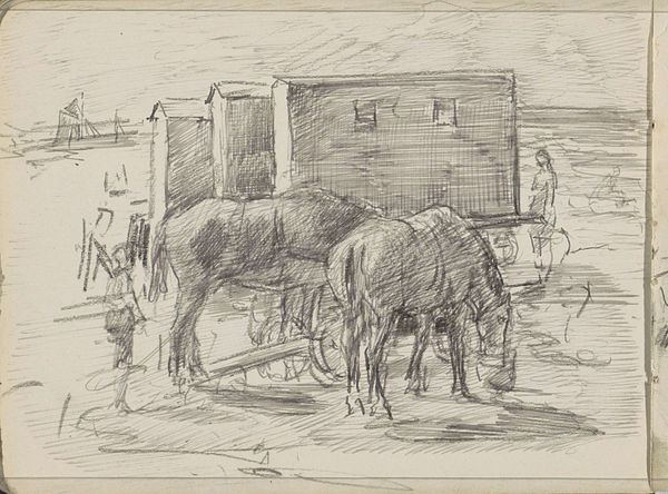 Otto Hanrath created this drawing, Amelandsche merrie, using graphite on paper. A sense of serene rural life emerges through the artist's formal choices. The composition is carefully structured, using the bulk of the horse as a central anchor. To the left, the geometry of the building and cart provide a contrast to the organic form of the animal. Notice how Hanrath uses line and shading to define the textures of the horse's coat, the rough surface of the building, and the grassy foreground. The delicate rendering of light and shadow creates depth and volume, giving the scene a tangible presence. This emphasis on materiality and form is critical. By focusing on the intrinsic qualities of the medium, Hanrath invites us to consider not just what is represented, but how it is represented. The drawing becomes a study in contrasts: between the natural and the man-made, the organic and the geometric, the light and the dark. This interplay of elements allows Hanrath to destabilize fixed meanings, offering instead a rich visual experience that is both aesthetically pleasing and intellectually stimulating.