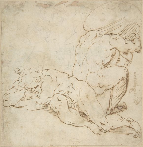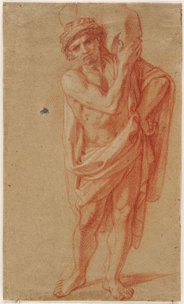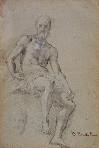 Govert Flinck made this drawing of a seated old man with a cloth over his lap, likely in the mid-17th century, using black chalk on paper. The choice of chalk is interesting; not quite as precious as ink, it allows for a wide range of tonal variation. Look closely, and you can see how Flinck uses broad strokes to suggest the fall of light across the man’s torso, contrasting with the more precise lines that define his features. The gray paper enhances this effect, acting as a middle tone from which the artist could build up shadows and highlights. Drawings like this were often preparatory studies. Flinck was a prolific painter, and this sketch may have been a way for him to work out the composition and lighting of a larger work. But it also stands on its own, a testament to the artist's skill in capturing the human form with just a few simple materials. The immediacy of the chalk on paper gives the work a sense of intimacy, as if we are witnessing the artist's creative process. It reminds us that even the most refined artworks often begin with humble materials, transformed by the skill and vision of the artist.
