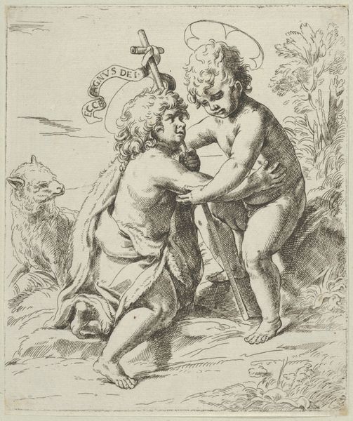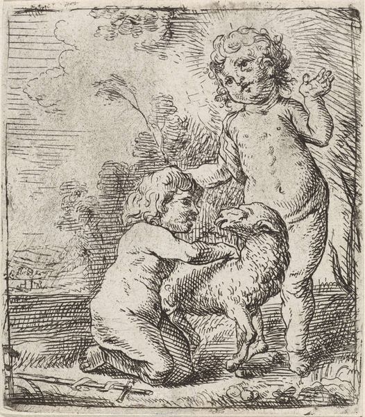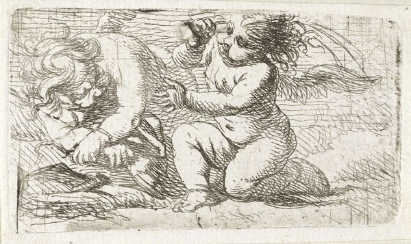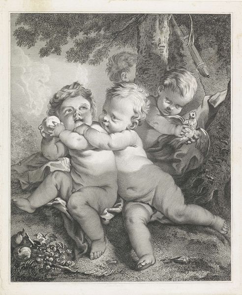 This delicate etching, made by Pieter van Avont, depicts two children and a satyr in a landscape. The children, with their fleshy forms, evoke classical imagery of putti, while the satyr, with its distinctly goat-like features, root us in the realm of classical mythology, symbols that are often associated with fertility. Consider the enduring presence of the grape motif, clutched by the child. The grape appears from ancient Dionysian revelries to Christian symbolism of the Eucharist. In the Renaissance, it appears, for instance, in Titian's "Bacchus and Ariadne." It is a symbol that carries the weight of centuries. The satyr, a being of primal instinct, speaks to the enduring human fascination with the wild, untamed aspects of nature, but it is ultimately a reflection of our subconscious desires. This symbol represents the ongoing tension between civilization and primal instincts. The image subtly suggests a world of shared cultural memory, reminding us of the cyclical nature of symbols and their power to evolve and adapt across time.