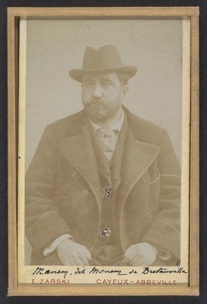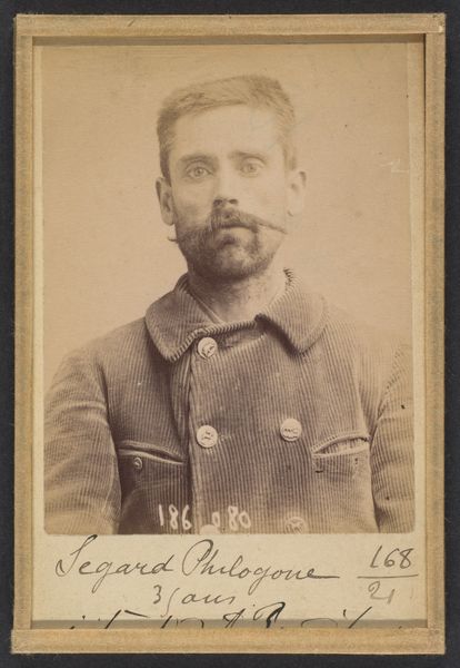 Curator: Before us we have an albumen silver print created in 1893 by Alphonse Bertillon. This piece, titled "Crespin. Joseph. 40 ans, né à Roquesteron (Alpes-Maritimes). Employé de banque. 25/3/93." resides here at the Metropolitan Museum of Art. Editor: There’s an unsettling stillness to it. It’s more than just the sepia tones of the gelatin silver print—the subject's intense gaze is almost accusatory, magnified by the fact it has aged and spotted across the emulsion over time. Curator: It's compelling how the constraints of early photographic technology directly affect the final aesthetic. We can read that through the composition, note how he seems confined by this box. Editor: Confinement is an interesting concept here, given Bertillon’s involvement in the criminal justice system. It makes you wonder if there’s something almost adversarial between subject and photographer, if this man, listed as a bank employee, has in some way been accused. Curator: We see photographic technologies that are meant to bring clarity instead are tied into themes of surveillance. Notice the direct and unwavering gaze, devoid of artifice. Its power comes from its simplicity. Editor: Absolutely. But this ‘simplicity’ masks the inherent power imbalance present. A white male gaze literally freezes the identity of this ‘Crespin’, marking him both through naming, age, profession and date – he's a case study already and not yet known to the viewer. Curator: Indeed. Bertillon pioneered anthropometry— a system intended to codify and categorize human difference, leading to racial bias and ableist thinking, all through measurement. And you do find those systems explicitly in how Crespin has been presented through a formal, nearly bureaucratic practice of cataloging. Editor: Precisely. Thinking of Barthes, there's this studium, the reality depicted—that Crespin existed, worked at a bank. And the punctum? It is Bertillon's system, embedding itself as the author of someone's documented fate through categorization. This is a study on photographic and bureaucratic objectification as much as a document of Crespin himself. Curator: Yes. We could study this photographic approach from different angles ad infinitum and still perhaps never reconcile these two ideas that seemingly conflict in purpose yet exist together. Editor: And those points of rupture is what I believe is truly thought provoking about this portrait and allows us to learn and grow from revisiting such a compelling yet discomforting artwork.