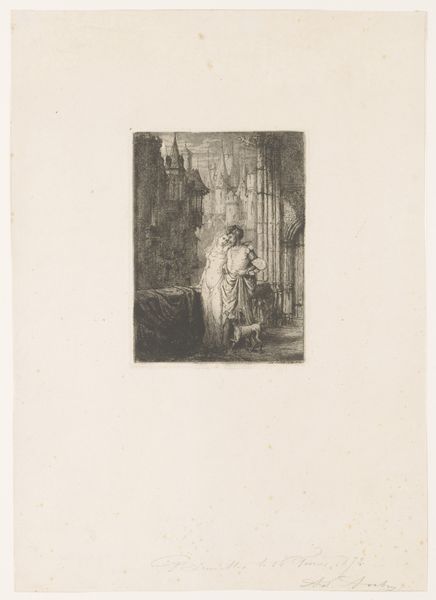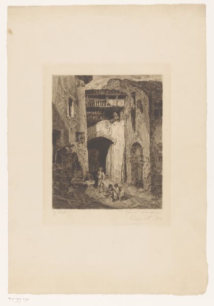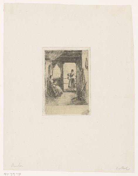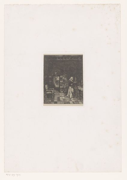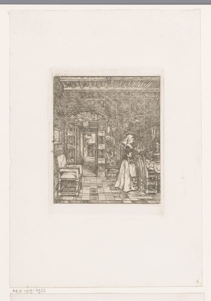 Editor: Here we have "Gezicht in een oude gang," an etching by W.F. Barber created sometime before 1909. The composition, all in blacks and whites, focuses on the deep perspective of an old hallway. It almost feels theatrical, like a stage set. What strikes you about it? Curator: The architectural representation here offers an intriguing glimpse into the past, but also raises questions about access and power within such spaces. The print, because it is reproducible, made it possible to disseminate such images to a wider public. How did seeing spaces like this function within society? Who was it trying to reach with these views of Dutch domestic life? Editor: So it's about more than just documenting a space? Curator: Exactly. The choice to depict this particular hallway, perhaps in a grand house, suggests an interest in portraying a certain kind of domestic environment and by implication certain values. It evokes questions concerning not just architecture, but the social narratives built around dwellings. Does the space welcome or intimidate? Editor: It does feel quite imposing, now that you mention it. I initially focused on the artistic skill involved in rendering the perspective. Curator: Indeed, the artist shows skill and perhaps he wants you to see a very specific narrative. Think about how exhibiting scenes of domestic life bolstered national identities. These prints, consumed within a wider culture of printed media, contributed to building what we may consider the mythologies of home, privacy and belonging. It allows you into this world, but only from a distance. Editor: That really changes how I see it. I was so focused on the aesthetic qualities, but you've helped me understand it as a historical object with its own set of cultural meanings. Thanks! Curator: Precisely, and I enjoyed discussing it. These artistic and cultural aspects are interconnected, enriching the meaning of the art itself.