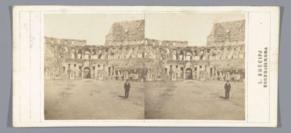 Curator: We're looking at a gelatin-silver print from between 1860 and 1870, titled "Gezicht op de Arena van Verona, Italië," attributed to Ferrier Père-Fils et Soulier. It’s a stereoscopic view of the ancient Roman arena. Editor: My first impression is a feeling of awe tinged with melancholy. The grandeur of the arena is evident, but the stark black and white and the slightly distressed print quality hint at the passage of time and the inevitable decay of even the most monumental structures. Curator: Precisely. Let’s consider the context of its making. The firm of Ferrier, Père et Fils and Charles Soulier were prominent producers of stereoscopic views, catering to a growing appetite for tourism and accessible versions of world monuments among the middle classes. These images became commodities. Editor: Absolutely. The arena itself is rich in symbolic weight, a physical embodiment of Roman power, spectacle, and even brutality. Its survival speaks volumes about cultural memory and the ways societies choose to remember and commemorate certain values. Even the statues feel incredibly present. Curator: And we must remember the materiality of that photographic print itself. A gelatin silver print required specific chemicals, a darkroom, skilled labor—processes often obscured in the final presented object. Its physical existence, handled and reproduced, becomes part of its story of circulation. Editor: Indeed, the play of light and shadow in this print creates a sense of depth and solidity, enhancing the arena's imposing presence. The arches themselves evoke the cycles of history and the constant interplay between past and present, strength and vulnerability. I see in each of the repeating archways echoes of triumphs, sufferings, communal experiences. Curator: So we’re both highlighting processes—one of production, and the other of social resonance— that give this piece power and weight. Editor: Yes. It strikes me now, that for a modern viewer, looking at this stereoscopic view feels strangely intimate. Curator: An artifact mediating memory and manufactured history.