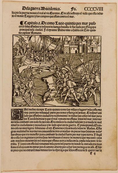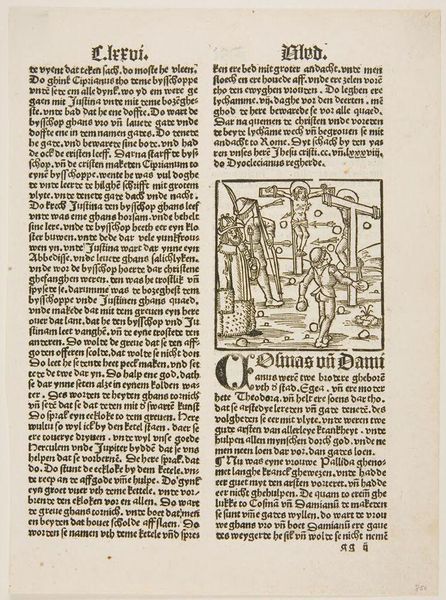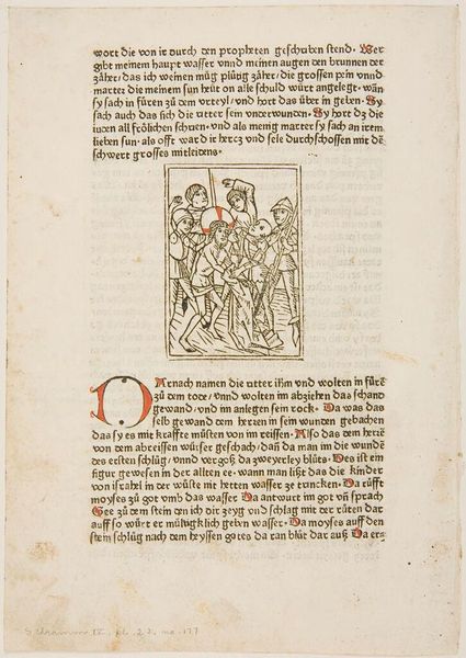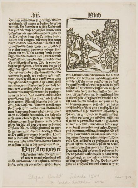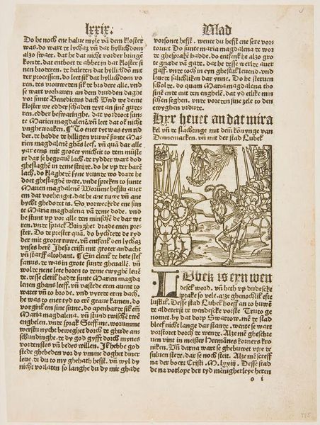 Editor: This piece is entitled "Illustration from Livy," and it seems to be an anonymous print from Johann Schöffer's workshop in Mainz. The stark black lines create quite a dramatic effect. What do you see in this work? Curator: Indeed, the image possesses a certain tension born from its formal arrangement. Notice how the figures are meticulously positioned, creating a structured narrative. The bold lines of the woodcut technique contribute to the overall impact. Editor: So, the composition and the technique are key? Curator: Precisely. The formal qualities of the piece, the arrangement of figures, the use of line, create a visual language that speaks to the story being told. Are there any other formal aspects that strike you? Editor: I guess I didn't notice how the lines create motion. Thanks. I'll look closer next time.