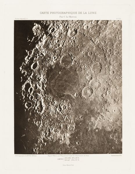 Curator: I am struck immediately by the sheer starkness of this lunar landscape—a photographic chart rendered in cool grays, like an ancient memory surfacing in the present. Editor: And that, in essence, is what it is: "Carte photographique de la lune, planche XIX (Photographic Chart of the Moon, plate XIX)", by C. Le Morvan, most likely made sometime between 1903 and 1914. It is an intriguing print, possibly a photomontage. Curator: The geometric shapes formed by the craters carry so much weight. It feels almost like gazing into a collective dream. Don't you get a primal sense of recognition, maybe from stories shared around a fire in some deep past? Editor: It does evoke the uncanny. This wasn't a satellite image, of course; it was painstakingly constructed from observations. Knowing the work involved gives it an added dimension—human curiosity and dedication writ large across the face of the moon. I keep looking for a "man in the moon," a humanizing presence in all this desolation. Curator: The lack of atmosphere heightens that desolation. These aren't just impact zones; each crater could symbolize emotional or psychological impact as well. In psychoanalytic terms, each mark represents something suffered, something lost. It reflects not only the moon's biography but our own collective past traumas, visible, but silent. Editor: True, there’s a brutal honesty to it—unfiltered information about damage over unimaginable timescales. However, for every shadow, there’s reflected light. Those geometric formations—the rims of the craters, the way they overlap—that also conveys resilience. Something about the scene speaks not just of loss but of an enduring and unchanging witness to all our struggles down here. Curator: Precisely! The geometric quality is reassuring. It reveals a sense of permanence, something that predates and will outlast us. This lunar face becomes a mirror, reflecting our fleeting existence, our small dramas played out beneath this immense, unchanging eye. It prompts questions about time, scale, and ultimately our own significance. Editor: Exactly. Looking at the picture again, one might even forget it is an image of the Moon. It feels almost allegorical—not of other-worldly realms, but some representation of what humans do, creating a sense of "order" on surfaces they encounter to make sense of the immensity of what they find. Thanks for lending that perspective. Curator: My pleasure, always insightful.