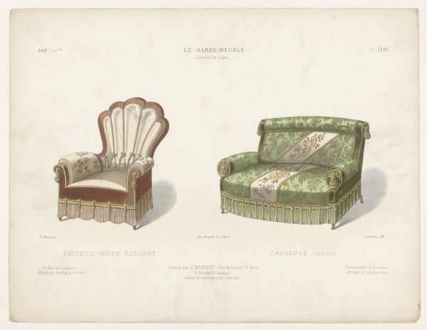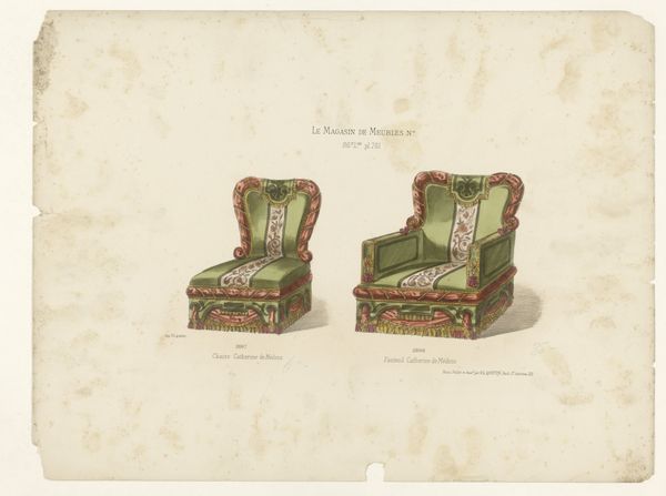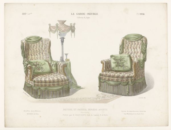 Editor: This drawing, titled "Fauteuil en stoel," likely created between 1885 and 1895 by Léon Laroche, features these fantastical armchairs rendered in watercolor. The details, the tassels, the elaborate trim...they strike me as ridiculously opulent. What's your take on it? Curator: Indeed. Consider the late 19th century context. The rise of industrial production allowed for wider access to decorative arts, influencing tastes and aspirations of the bourgeoisie. These chairs represent a certain theatricality—a performance of wealth. It also references shifts in interior design fueled by access to global markets; imagine what kind of sitting room this "fancy chair" would occupy. Do you get a sense of the aspirational values it embodies? Editor: Absolutely. It's not just about comfort, but about conveying a particular image of leisure and refinement. This definitely has an “old money” aesthetic. Curator: Perhaps...But “old money” usually shies away from the flamboyant, isn't it? In a sense, drawings like these, circulated in publications, democratized luxury by offering designs that could then be copied, or simply aspired to. Were they for aristocratic consumption, or something aimed at aspiring classes? Editor: That's a good point, it could be an aspirational advertisement. So it’s less about old wealth, and more about the *desire* for wealth being sold. I hadn’t thought about it that way before. Thank you for making that distinction. Curator: Always a pleasure to re-examine assumptions, and observe objects in relation to larger social phenomena. It transforms how we interpret these items!