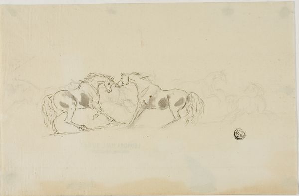 Curator: Looking at "Stableboy Grooming a Horse," rendered in graphite on paper around 1814 by Théodore Géricault, one can see a wonderful example of his early exploration into equine anatomy. Editor: The first thing I notice is its vulnerability, the fragility conveyed by the medium itself—graphite on paper. It speaks to the inherent power dynamics between humans and animals, doesn't it? Curator: Indeed. The lines are loose, almost ethereal. Géricault captures the horse's tension, its weight. Note how he emphasizes the muscular structure; it's as if he’s seeking to understand the animal's very essence. Think of how the horse features as a symbol of power across so many eras! Editor: And domination. These seemingly pastoral images often obscure histories of labor, class, and exploitation. The groom is also faceless, nameless. He's rendered merely as a tool for maintaining the horse's power. It begs the question: whose story are we really seeing here? Curator: Well, it is important to see how the motif of grooming takes on complex social meanings—it's about more than just appearances, after all! The act carries significant symbolic and psychological weight related to both taming and idealizing animals. It resonates with the theme of the "noble savage," the individual unspoiled by civilization. Editor: I appreciate the Romantic era’s obsession with authenticity and the natural world. However, there’s a critical distance we need to maintain. Aren't we simply transferring the desire to return to a natural past onto animal bodies and idealizing our connection to it? How can we reckon with its complicated colonial implications? Curator: A powerful and necessary intervention. By looking at it critically and exploring that tension, we ensure these past visions still spark important conversations. Editor: Precisely. I hope it allows viewers to reflect critically on the history being conveyed. Curator: Yes, to unravel the various symbolic threads intertwined with themes of mastery, labor, and perhaps even something a bit gentler between the horse and his keeper.