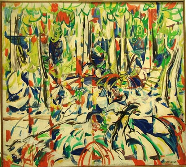 Curator: Gazing upon Pierre Alechinsky's 1951 piece, "Les hautes herbes," one encounters a canvas pulsating with abstract forms, rendered in mixed media. What impressions strike you initially? Editor: A delightful visual buzz! It feels like peering into a sun-drenched meadow, but translated through a Cubist's dream. The way the light plays...it's almost overwhelming, yet undeniably playful. I sense the chaotic beauty of nature. Curator: Indeed, the dynamism is key. Note how Alechinsky, associated with the Cobra movement, employs an intuitive, almost impulsive, approach. The high grass motif isn't just representational. It is also symbolic, reflecting a broader theme within Cobra—the desire to liberate art from formal constraints, to tap into primal expression. The tall grass could be the uncultivated part of ourselves. Editor: That’s so interesting! There is a primal rawness but I would have guessed music rather than wild nature – maybe a really intense, improvisational jazz piece…the colours even have their own sounds: muted yellows, the sharper greens...Does that fit with that symbolic liberation? Curator: Absolutely. The intuitive, stream-of-consciousness style embraced by Cobra aimed to break free from post-war intellectual stagnation and tap into something raw and instinctive. And music and rhythm become a perfect symbolic language for that effort to escape control. Notice the repetition of vertical lines – the grass itself. In various traditions, verticality symbolizes aspiration, growth. Alechinsky’s densely packed composition presents an abundance of such striving, but also an impediment; like struggling through that high grass to get somewhere. Editor: Yes, I definitely feel a sense of movement. It's a constant interplay between feeling contained and being impelled forward – that adds another layer of richness to this chaotic, buzzing image. There's an anxiety there, or a constant reaching…but somehow still fun. So interesting. Curator: The joy and struggle existing simultaneously – a reflection perhaps, of the post-war artistic psyche searching for renewal in unconventional forms, while wrestling with the implications of that freedom. A meadow is hardly an innocent field in those years. Editor: It feels remarkably present even now! Well, that image has certainly ignited a spark. It's liberating to explore how layers of emotion, memory, and perhaps struggle can be compressed into seemingly chaotic expression and take on their own complex voice. Curator: It does remain remarkably lively, a landscape not just observed, but deeply felt. And as you noted it does allow us to see what resonates from these cultural explorations, from all these complex histories, even now.