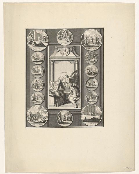 Curator: Stepping up to this intricate engraving, you’re faced with “Abraham, Moses, and Solomon,” a piece etched between 1768 and 1771. Currently held at the Rijksmuseum, this artwork presents an intriguing tableau rooted in both history and allegory. Editor: Wow, my first thought? It’s intensely architectural but then also… weirdly unbalanced? The stark geometric shapes contrast with these flowing, almost surreal vignettes tacked on either side. I feel drawn in but also a bit lost, like stumbling into someone's very organized fever dream. Curator: It certainly possesses a constructed artificiality that contrasts to, say, earlier renaissance history-painting. Here, we see clear allegorical elements blended within that historical framework. How does this intersect with your personal feeling of 'unbalance'? Editor: I think that is precisely because of those allegorical trappings. They seem deliberately placed, like props, hinting at deeper stories while remaining just out of reach. This makes it conceptually weighty while, aesthetically, something like a stage set. What historical stories or allegories are presented in the engraving? Curator: The engraving attempts to portray a grand historical sweep in two discrete blocks, presenting key figures across biblical history, from Abraham to Solomon. Its allegorical component encourages us to consider ideas of lineage and transition—connecting the visual symbolism within to broader cultural understandings of history, legacy, and power in late 18th-century Europe. Think empire-building! Editor: Right. I suppose those figures at the base add to that sense of legacy. But you know, for a piece so concerned with history and power, the choice of medium - printmaking - seems… democratic? Almost rebellious, for the time, compared to large oil paintings for nobility. Curator: Exactly. It opens up fascinating avenues when looking at questions surrounding art, access, and dissemination of knowledge. The very nature of engraving makes the historical and allegorical dimensions accessible to a wider audience. Editor: Well, I’m finding it strangely relevant in our own time where truth and storytelling are being constantly re-negotiated across visual media. What’s powerful is how art forces you to pause and disentangle everything! Curator: Agreed. The complex intersections between history, representation, and the artistic medium can prompt some valuable conversations.
