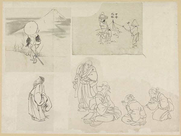 Curator: What a fascinating sheet of studies. This drawing, attributed to Katsushika Hokusai, and dating from sometime between 1800 and 1900, is titled "Vijf voorstellingen van mensen in verschillende situaties," or "Five depictions of people in various situations." It’s executed in ink on paper. Editor: My first impression is of intimacy and observation. These small vignettes, each with its own framing, feel like stolen glances into everyday life. The overall tone seems gentle, almost affectionate. Curator: I agree. The materials themselves speak volumes. Ink on paper, simple and readily available, emphasizes the accessibility of the depicted scenes. Consider the production—likely part of Hokusai's teaching process, showing scenes for aspiring artists to copy or learn from. The consumption of such imagery was undoubtedly widespread, fostering a shared cultural understanding. Editor: The line work itself is remarkable. Notice how economical each stroke is, conveying so much with so little. The compositions within each vignette also draw the eye, leading it through the narrative suggestions, from the serene central scene to the playful movement in the upper register. There’s a quiet, structural elegance here. Curator: Absolutely. And what about the social context? Ukiyo-e prints and drawings like these, though often associated with mass production, also represented a significant shift in the art world. They democratized art, making it available to a broader audience beyond the elite. Hokusai, through his focus on genre scenes, celebrated the lives and labor of ordinary people. Editor: The formal repetition also seems very calculated: the shared medium, a unifying palette of diluted blacks, and the spatial organisation all underscore an interconnectedness between the distinct scenes. A reminder that the personal and societal exist interdependently. Curator: The choice to depict genre paintings reinforces the intent of representing the contemporary world that surrounds Hokusai, moving from representing only idealized worlds, towards more everyday representation. Editor: Looking closely has revealed that these sketches, with all their seemingly simple qualities, are a carefully balanced collection, drawing viewers into moments both familiar and timeless. Curator: And placing it within its context highlights the intersection of art, craft, and commerce in shaping popular visual culture.
